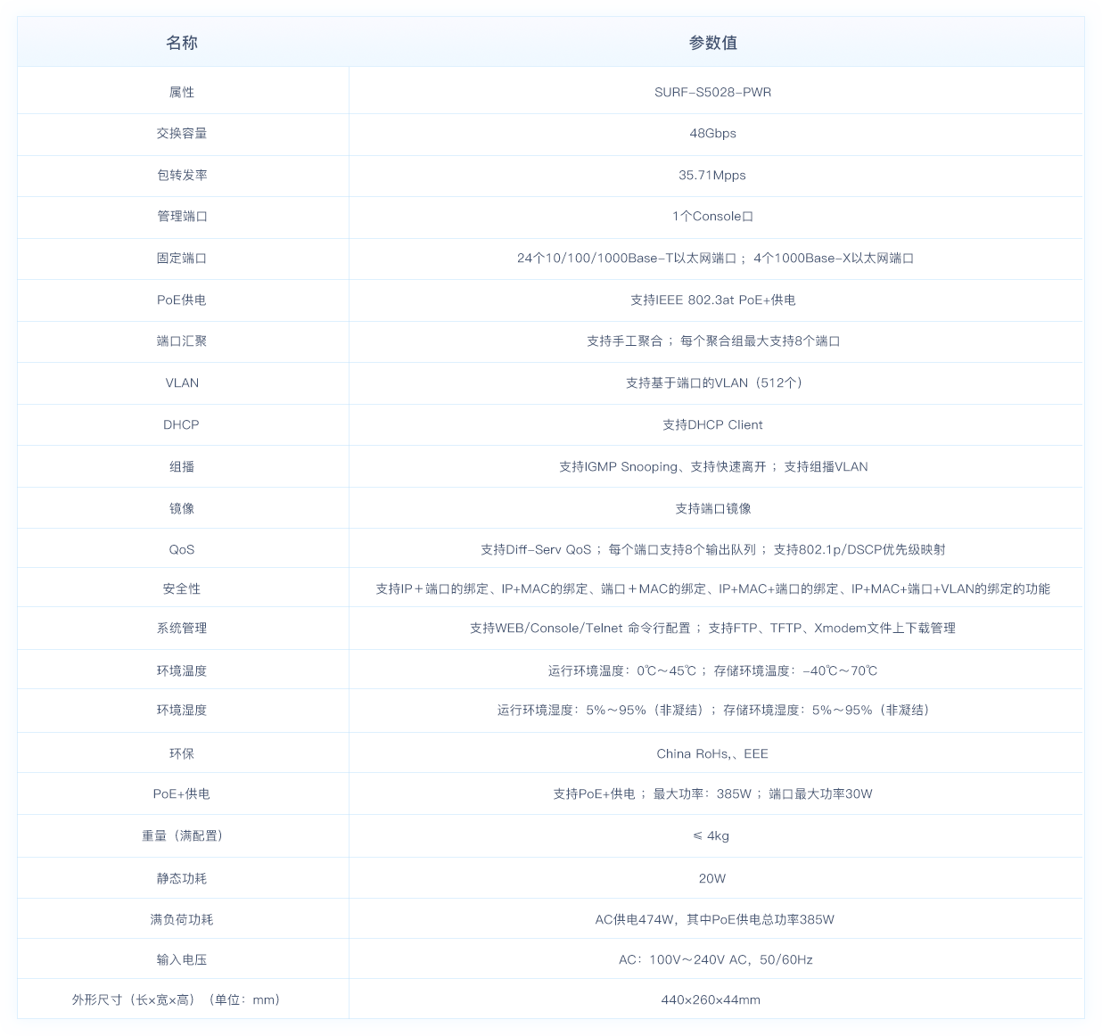 SURF-S5028-PWR 24口PoE千兆以太网交换机是绿色节能全千兆以太网交换机产品,具备丰富的业务特性,广泛应用于中小企业网和网吧的接入。在满足高性能接入的基础上,提供更全面的安全接入策略和更强的网络管理维护易用性是千兆接入的理想选择。